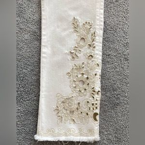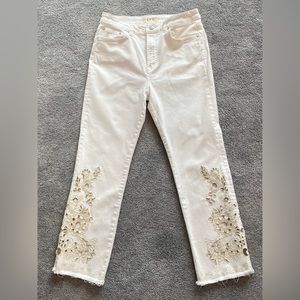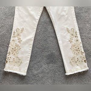 Elegant cream jeans with intricate floral embroidery. Perfect for a stylish look.