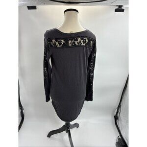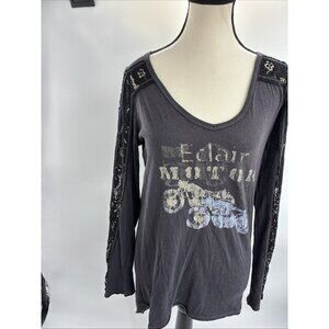 We The Free Womens XS Black Long Sleeve Graphic Top Lace Inset Boho Motorcycle