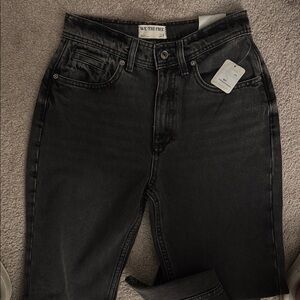 jeans feature a high-rise fit and rigid cotton fabrication with slim straight-legs and 5-pocket styling.