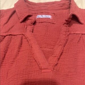 Chic coral blouse with textured fabric. Features a collar and button details. Lightweight and layer-able. Linen like crinkled gauzy, all season, #hippie #vintage #coastal