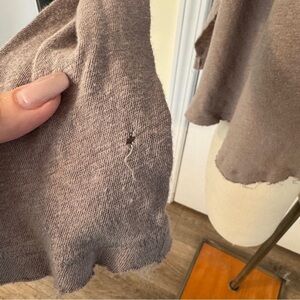 Gently worn. Two small holes near the hem and sleeve that blend in with the overall distressed aesthetic — looks intentional and consistent with the design. See photos.