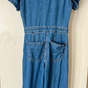 Effortless one-and-done denim jumpsuit with a Western-yoke detail, short sleeves, front pockets, tapered legs, and a zip/snap front. Elasticized waist for shape. Soft 100% cotton denim; made in Morocco. Vintage-inspired. Good pre-owned condition with natural denim fading. (missing one snap)