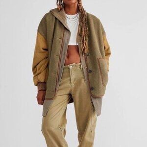 A long bomber style jacket with fleece and sleeves are made of quilted sweatshirt material. In great condition with the exception of slight pilling in some places on the INSIDE and two small stains on the left sleeve, very hard to see. A generous size M - usually wear a L but plenty of room in this coat for layering.
