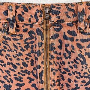 Super fun denim mini skirt featuring a leopard print design and ragged cut edge at the hem. It measures 14 inches at the waist laying flat and 23.5 inches in length.