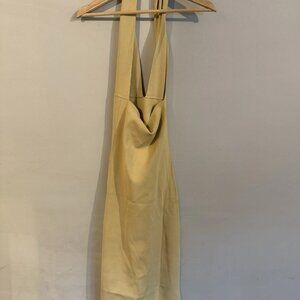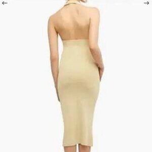 The We Wore What Revolve Dress is a stylish and sophisticated choice for any special occasion. This fully fashioned rib halter midi dress in wheat color features a sleeveless design with a backless detail, perfect for a wedding, party, or formal event. Made from a blend of nylon and viscose, this fit and flare slip dress is easy to care for with machine washable instructions. The dress is in size M and the brand is We Wore What, known for their trendy designs. This sexy and chic dress is ideal for the summer, fall, and spring seasons