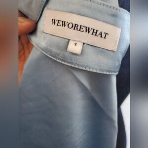 Revolve WeWoreWhat light blue satin halter top with halter neck. Open back with tie strap closure. Made of 100% polyester.