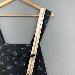 Floral denim (SIZED MEDIUM) overalls by We Wore What. These overalls feature a black denim base adorned with a scattered pattern of blue flowers.