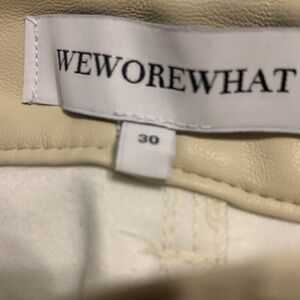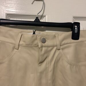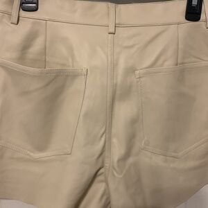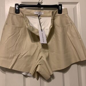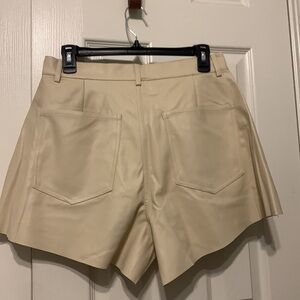 NWT polished flared short. Zip fly & button closure. 16” flared leg opening. 4 pockets. Size 30(12) Color Crème Brûlée. 14.5” waist, 3.5” inseam 13.5” rise. Vegan leather.