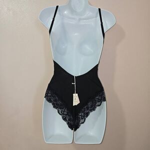 Open back bodysuit with adjustable straps & double lined in the front. Made from ultra comfy knit fabric & stretch lace. Ruching in the back with a cheeky fit.
