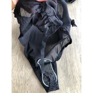 This bodysuit is gorgeous. It features a sheer mesh fabrication that has an accenting delicate lace detail. The ruffle trim gives it a feminine feel while the keyhole cutouts give it a sexy twist. It is a formfitting pull-on style. It has a G-string bottom. It has deep V neckline that is accented with adjustable shoulder straps that have a back hook closure. Open back style with ruching at the lower back.
