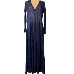 This stunning blue sheer gown features a flattering V-neckline perfect for a resort getaway. Its long, flowing silhouette adds a touch of sophistication, making it an ideal choice for a stylish and comfortable look. The dress's intricate texture enhances its luxurious appeal, ensuring you stand out in any setting.