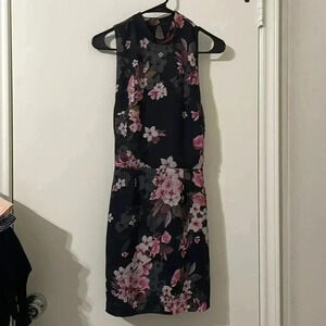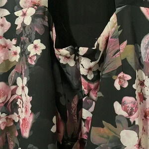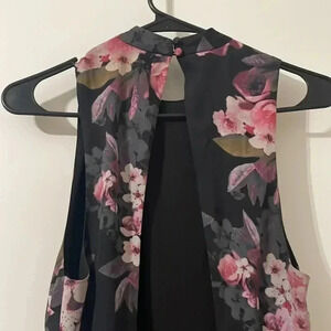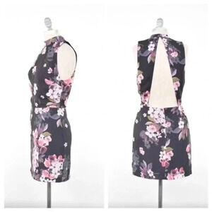 Gorgeous pink floral print on a black background. Large triangle shaped cut-out at the back.