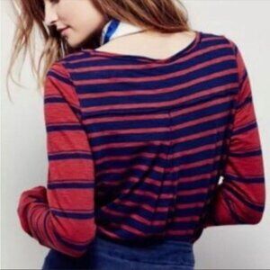We the Free Burnt Red Blue Mix It Stripe Tee Women Small Long Sleeves Distressed