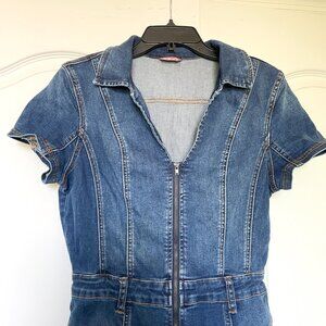 We the Free CRVY Dark Wash Denim Short Sleeve Zip Up Flare Jumpsuit