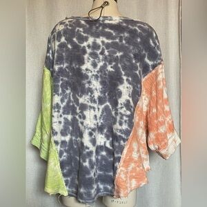 Fun colors of white, blue, orange and green in tie dye pattern. Distressed with raw and exposed seams and hems. Oversized. Great with shirts or jeans. Perfect beach/pool coverup.