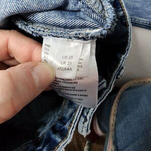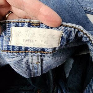 Introducing a pair of We the Free women's jeans in size 25 and a stunning blue color. With a solid pattern and zip closure, these jeans are made of 100% cotton denim material and feature distressed accents and fringe for a modern look. The Dakota model is a straight leg style with destroyed details, and includes pockets as a feature. These pre-owned jeans are perfect for adding to your wardrobe and elevating your style.