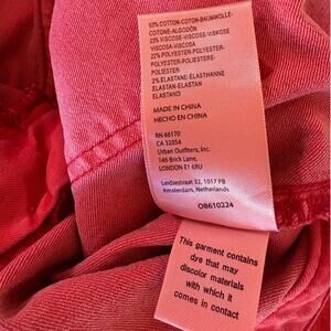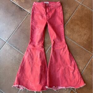 We the Free jeans in fair condition because they have what appear to be bleach spots and dye stains. Otherwise, they're in good condition without any pilling, worn spots or holes. They don't seem to have been worn much. I washed them hoping to get the discoloration out, thinking it was dirt, but it didn't budge so now I think it's dye. Most of it is on left front side near waistband-see photo-but there was a small amount on right front leg-see photo. The bleach splotches are scattered and random, as seen in the photos. The jeans are made from fabric with a lot of stretch and the flares have a raw hem detail. The color is somewhere between coral and rust. Measures app'x: 13 across waist, 11 rise and 31 inseam.