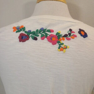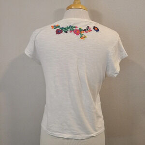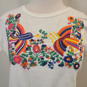 We the Free Otomi Mexican Embroidered Tie Front Top. This top has short sleeves, a crew neckline, cropped length with a tie front. It has beautiful Mexican style embroidery with flowers and birds on the bodice and back. It’s in great preowned condition, there are a couple loose threads.