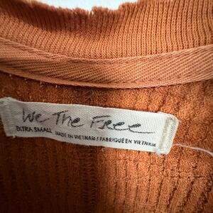 We The Free (Free People) oversized thermal long sleeve pullover in a rich pumpkin spice orange. Size XS (runs oversized). Features a V-neck, waffle knit texture, raw seams, and high-low hemline with layered band detail. Perfect for cozy fall fits or casual layering. Made in Vietnam. Soft, lived-in feel with slouchy boho charm.