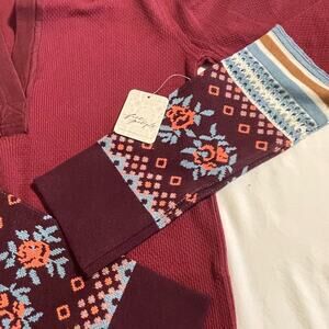 Free People “Mikah Layering Cuff” – stunning henley-inspired long sleeve thermal top featuring a colourful boho-ethnic inspired design on the cuffs, V-neck flattering true to size fit, very soft and stretchy fabric. Must have in your wardrobe, indeed!