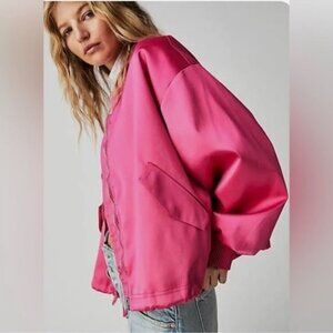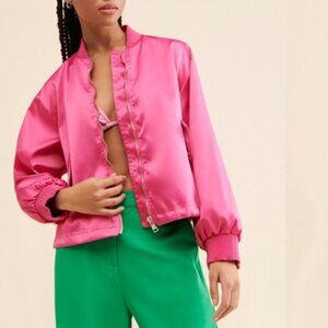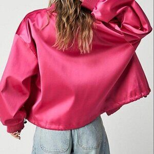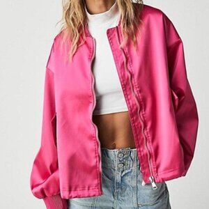 Taking any look to the next level, this cool and classic bomber jacket is featured in an oversized, slouchy fit and silk-inspired fabrication with ribbed hems and drawstring detail at bottom for added shape.