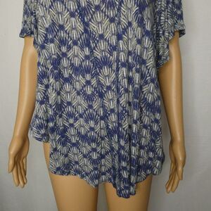 Rayon/linen blend t shirt with all over print, cold shoulder detail, and fluttery sleeves. Pooches a bit at the shoulders where it was on a hanger, but overall in excellent condition. Oversized.