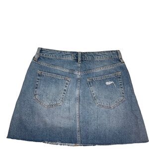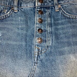 We the Free Denim Jean Skirt. High Waist. Distressed. Button Fly. Size 28. Waist measures 14” lying flat.