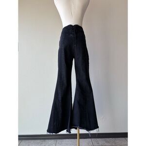 features high rise, zip fly, three front pockets, bareback pocketless, back waist lace up waist, flare leg