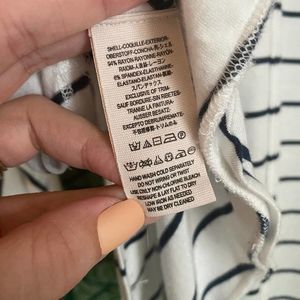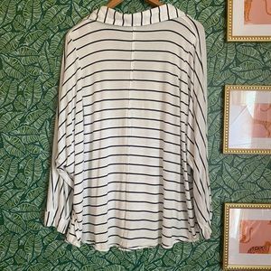 features | V neck with fall back collar, three quarter sleeves, boxy fit, soft stretchy white material with navy stripes
