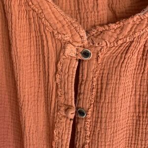 🎉HP 🎉 We the Free tunic top in perpetual sunset orange/coral color has buttons down front with long buttoned sleeves at cuff and frayed trim. Curved hemline to tuck in and scooped neckline. Comfortable cotton material with oversized silhouette. Excellent Condition