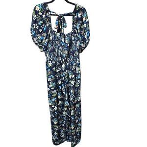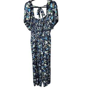 Details: tie back, short puff sleeves, all over print, lightweight, front pockets, smocked stretchy upper and waist, cropped wide leg