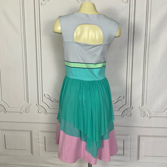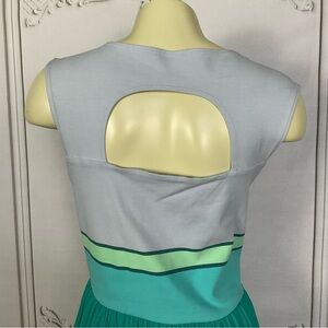 Fitted top, sleeveless with keyhole on back. Multilayer skirt.