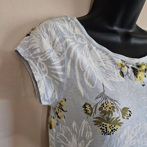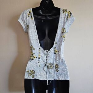 This is a short sleeved t-shirt by We The Free, a Free People brand. It is light blue with yellow and white floral print. The back is low cut with a corset style lace up panel, as shown in the photos.
