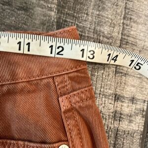 Rust brown distressed denim shirt with button closure and four pockets. 100% cotton