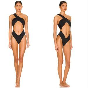 WeWoreWhat Asymmetrical Crossover one piece swimsuit Black Gold Ring Detail NWT