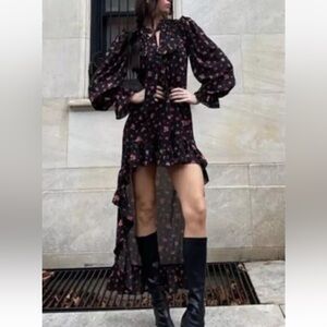 Elegant black high-low dress with a floral pattern. Perfect for any occasion.