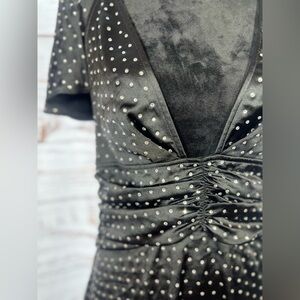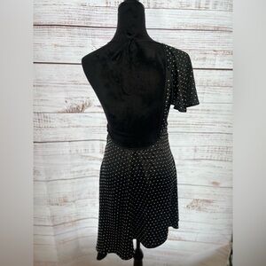This chic black dress by WeWoreWhat is designed with a ruched detail and a stylish one-shoulder cut, perfect for a cocktail night out. The short sleeves and plunge neckline add a touch of elegance to its sheath silhouette, making it a standout piece for any evening occasion! No flaws, no missing rhinestones!