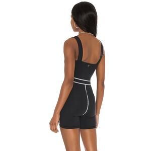 Featuring a body-hugging style accented by corset-inspired contrast stitching with supportive straps and bike short style legs.