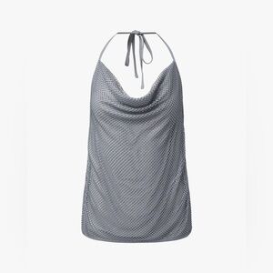 This draped cowl neck top is made from crystal netting, lined in mesh. It has halter ties at the neck and adjustable straps across the open back.