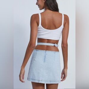 NWT WeWoreWhat Denim Cutout Mini Skirt in Color Super Light Size S, cut out at waist, buckle on side, rear zipper closure, brand new in poly bag, smoke free home