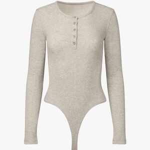 Stylish gray bodysuit. Features long sleeves and button details. Perfect for casual wear.