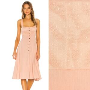 Feminine and flirty, this peachy-toned Harper Dress from WeWoreWhat features a bustier-style bodice with a mesh overlay, flattering seams, and a full front button closure. The adjustable straps ensure a perfect fit, while the unlined cotton blend keeps things breathable and light for warmer weather. An effortless summer staple for brunch, beach days, or date nights.