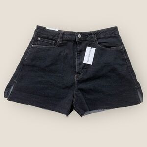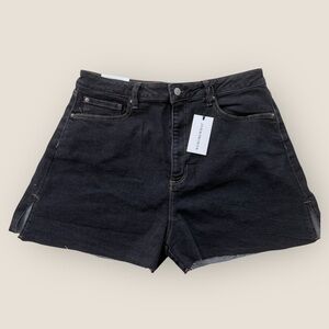Brand new with tags. These ultra-flattering boyfriend shorts by WeWoreWhat feature a high-rise fit, soft-stretch black denim, and a relaxed silhouette for everyday ease. Finished with raw hems, back pockets, and contrast stitching for a timeless look.