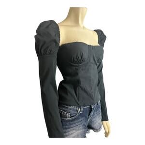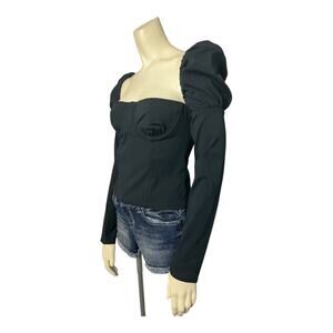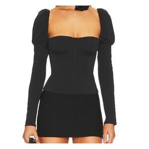 WeWoreWhat Long Sleeve Fitted Corset Top Black Women's 4 Goth Dark Academia Pre-Owned - Good Fitted Sweetheart neck Solid pattern Unpadded underwire cups Back hook and eye closure Long sleeve Puff shoulders Jersey fabric 54% rayon, 44% nylon, 2% spandex Contrast Fabric: 80% nylon, 20% spandex Hand wash trendy, y2k, summer, modern, playful, feminine, goth, emo, whimsy goth, whimsical, unique, stylish, night out, flattering, flowy, bold, blouse, top, corset top, dark academia