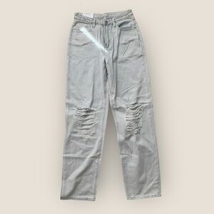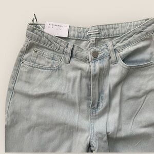 Brand new with tags. Light wash denim with bold front distressing, straight leg cut, and flattering mid-rise fit. Features soft cotton-blend denim with minimal stretch. Note: Small faint defect shown in last image.