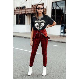 **WeWoreWhat Plaid Moto Overalls SLIM FIT Pompeian Red Women's sizes XS and S. NEW WITH TAGS!