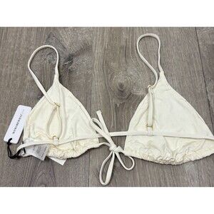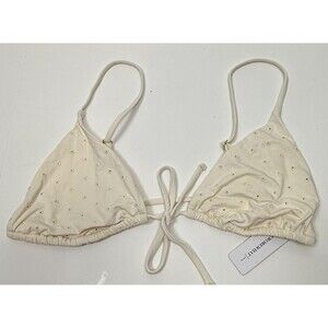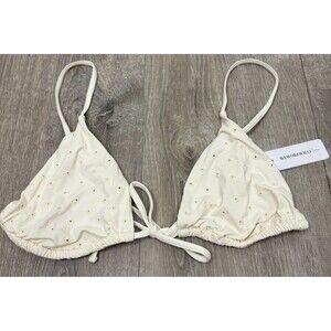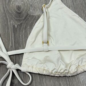 NWT WeWoreWhat triangle bikini top in cream eyelet. Features a front tie, adjustable straps, and classic triangle styling with a modern twist back straps. The delicate eyelet fabric adds a romantic cottagecore and boho vibe while the lined stretch designer swim fabric provides comfort and style. Flattering and feminine, perfect for beach days, pool lounging, or resort wear. Mix and match with other neutrals or soft floral bottoms. Brand new with tags, tag size XL.