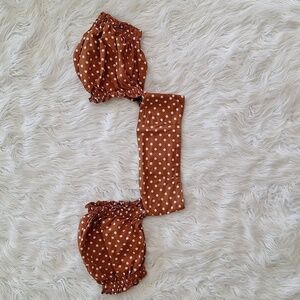 The Coco Top is designed with puff sleeves that can be adjusted to sit on or off the shoulders. It features ruffled shirring on a clean-cut bandeau top with a square neckline and an open back. The smocked back gives it a flexible comfortable fit. Color is a brownish orange.