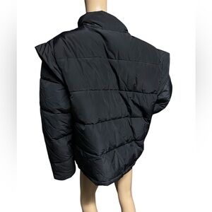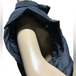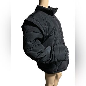 Very nice puffer convertible coat/vest in excellent condition! Size L with a relaxed oversized fit. Snaps in sleeves are pristine condition. Hand pockets have snap closures. The waist has a hidden toggle elasticized drawcord also in excellent condition. Wrist cuffs are elasticized, fitted. Nice puffer! See flat lay measurements below before purchase!