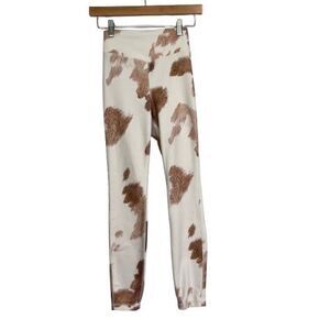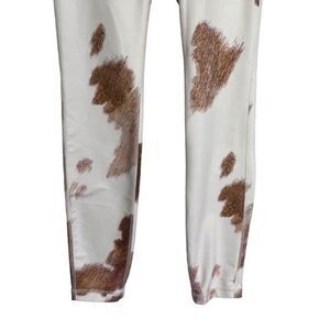 We Wore What Women’s V Shape Cowhide Print High Waisted Leggings in Off White / Brown, size Small. These feature a distinctive cowhide or cow print pattern in beige and brown tones. Constructed with flatlock seams for a seamless fit, a wide waistband, and a pull-on style. The V-shape refers to the waistband design.